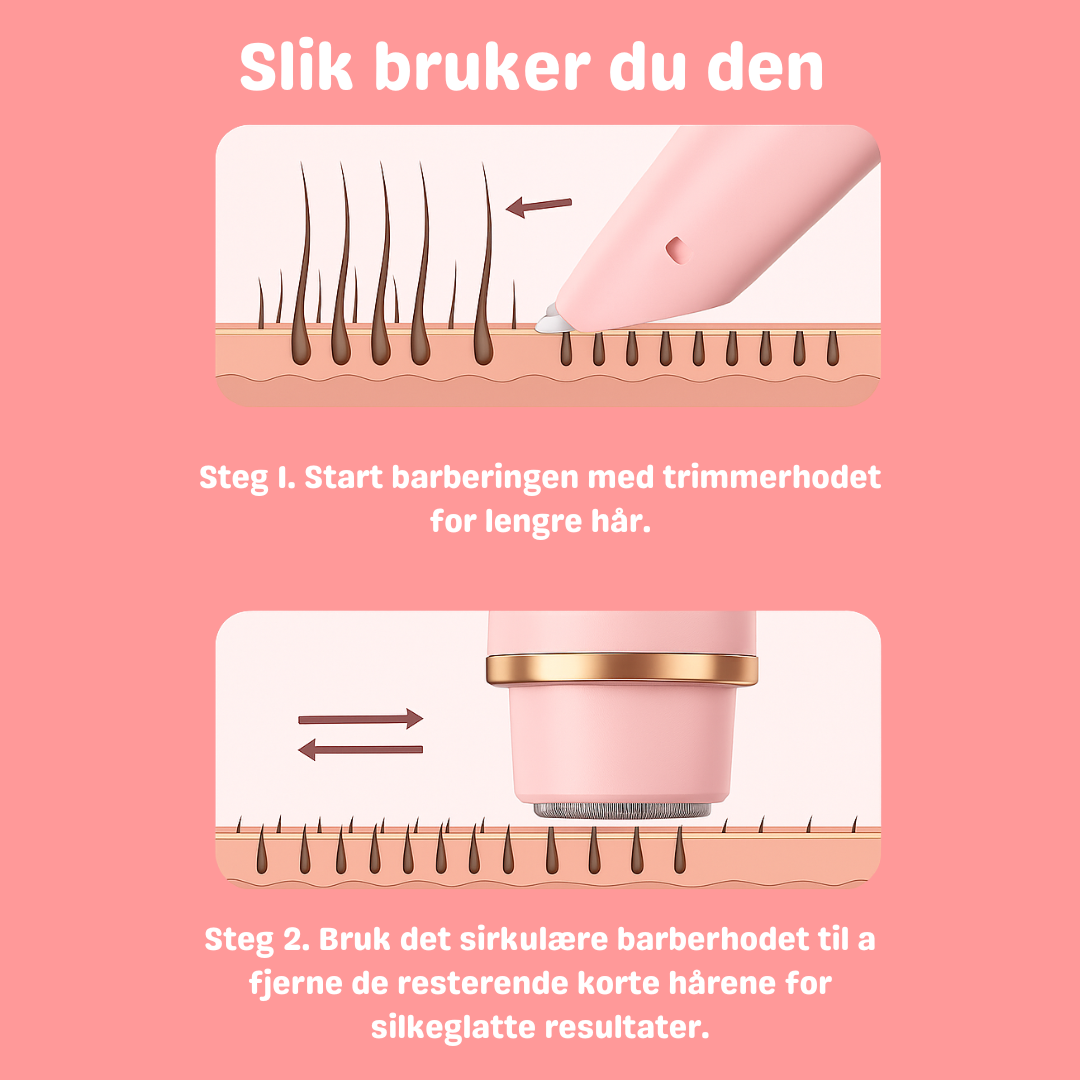 Den har to barberhoder, et som fanger de lengre hårene og ett som tar de korte. Sammen gir de deg jevn, silkeglatt hud på bare noen sekunder.